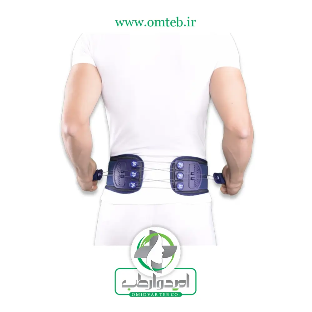اعمال فشار نهایی (قرقره): دستگیرههای متصل به کابلها و سیستم قرقره را بگیرید. دستگیرهها را به آرامی به سمت جلو بکشید. با کشیدن دستگیرهها، سیستم قرقره فعال شده و نیروی کششی قویای را اعمال میکند که باعث میشود بریس محکم دور کمر بسته شود.